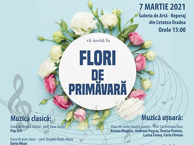 Centrul de Cultură al județului Bihor și Consiliul Județean Bihor vă invită să participați în data de 7 martie 2021 la concertul "Flori de Primăvară" susținut la Galeria de Artă - Reperaj din Cetatea Oradea, începând cu ora 15.00.