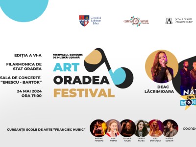 Centrul de Cultură al Judeţului Bihor prin Şcoala de Arte „Francisc Hubic”, vă invită să participaţi la Festivalul-Concurs Naţional de Muzică Uşoară „Art Oradea Festival” – ediţia a VI-a, în data de 24 Mai 2024, la Filarmonica de Stat din Oradea, începând cu ora 17:00.
