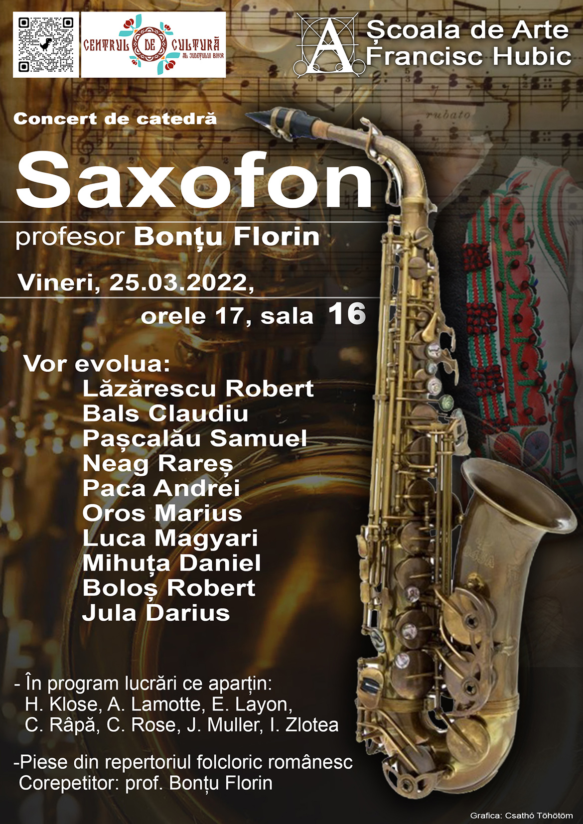 Vineri, 25 martie 2022, de la ora 17:00 la sediul Centrului de Cultură al Județului Bihor (sala nr.16) a avut loc concertul de catedră al clasei de saxofon coordonată de prof. Florin Bonțu, din cadrul Școlii de Arte ,,Francisc Hubic” din Oradea. În programul concertului au putut fi audiate lucrări muzicale din creația compozitorilor H. Klose, A. Lamotte, E. Layon, C. Râpă, C. Rose, J. Muller și I. Zlotea în interpretarea cursanților: Lăzărescu Robert, Bals Claudiu, Pașcalău Samuel, Neag Rareș, Paca Andrei, Oros Marius, Luca Magyari, Mihuța Daniel, Boloș Robert și Jula Darius.