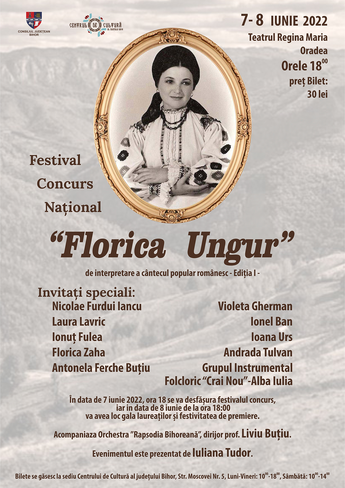 În perioada 7-8 iunie 2022 vă așteptăm în Sala Mare a Teatrului Regina Maria din Oradea , începând cu ora 18.00 , să luați parte la Festivalul concurs național "Florica Ungur" Ediția I. Biletele se găsesc la sediul Centrului de Cultură al Județului Bihor, str. Moscovei, nr. 5, de luni pâna vineri între orele 10 - 18 și sâmbătă între orele 10 - 14. Prețul unui bilet este de 30 de lei /zi. Vă așteptăm cu drag.