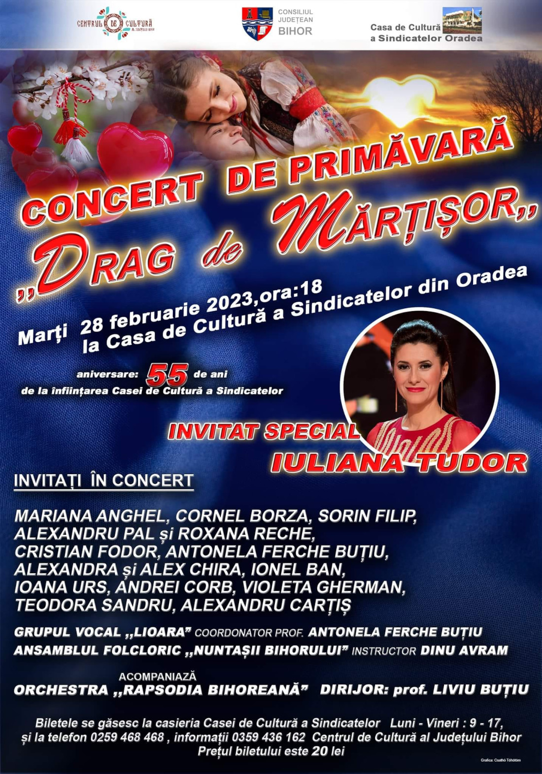 În ajun de mărțișor și în așteptarea primăverii, vă invităm la concertul extraordinar de primăvară "Drag de Mărțișor", din a cărui distribuție fac parte artiști iubiți de dumneavoastră, alături de îndrăgita realizatoare și prezentatoare, dna. Iuliana Tudor.