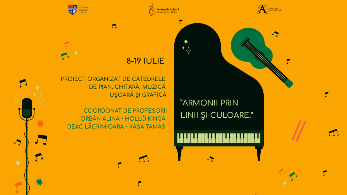 Timp de 2 săptămâni, între 8 și 19 Iulie, la Școala de Arte ”Francisc Hubic” din Oradea, se va desfășura proiectul ”Armonii prin linii și culoare”, o inițiativă care își propune să unească catedrele de pian, chitară, muzică ușoară și grafică, în urma căreia cursanții să își vor îmbunătăți și exersa abilitățile artistice, iar cei de la grafică să transpună pe hârtie ceea ce percep prin sunetele auzite, prin linii și culoare. Proiect coordonat de profesorii: Orbán Alina, Holló Kinga, Deac Lăcrimioara și Kása Tamas.