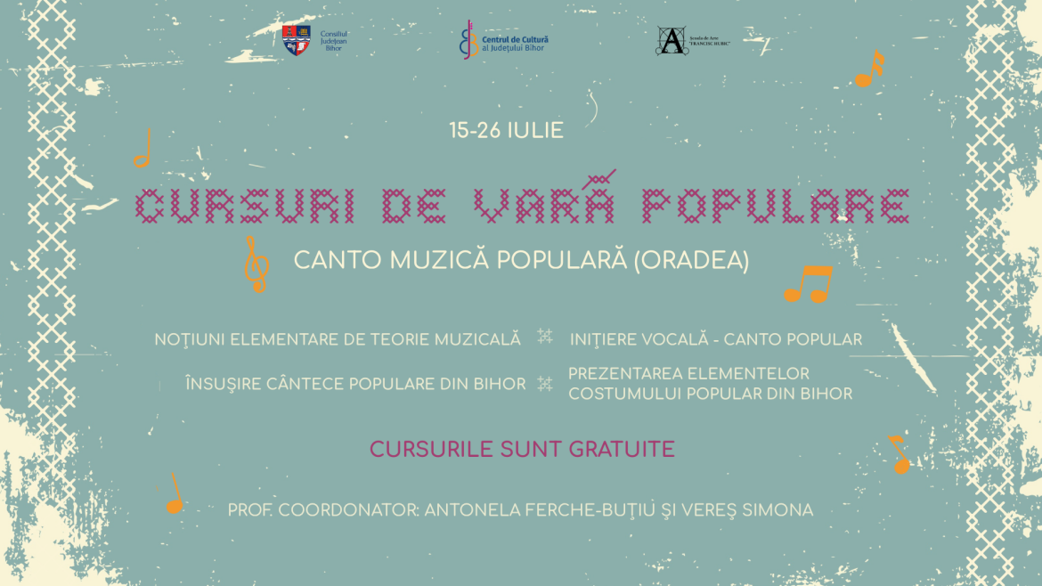 Nu în cele din urmă, ”Cursurile de vară populare”, vor oferi doritorilor cursuri de inițiere vocală în muzica populară în perioada 15-26 Iulie, prin care tinerii cu vârste cuprinse între 12 și 25 de ani vor dobândi noțiuni elementare de teorie muzicală, pe lângă inițierea vocală, își vor însuși cântece populare din Bihor, fiindu-le prezentate și elementele costumului popular bihorean. Toate acestea sub coordonarea profesorilor Antonela Ferche-Buțiu și Vereș Simona. La cursurile de vară se pot înscrie un număr de maxim 15 tineri, iar participarea este gratuită, și acestea se vor desfășura la Școala de Arte ”Francisc Hubic”, situată pe Str. Moscovei nr. 5, Oradea.