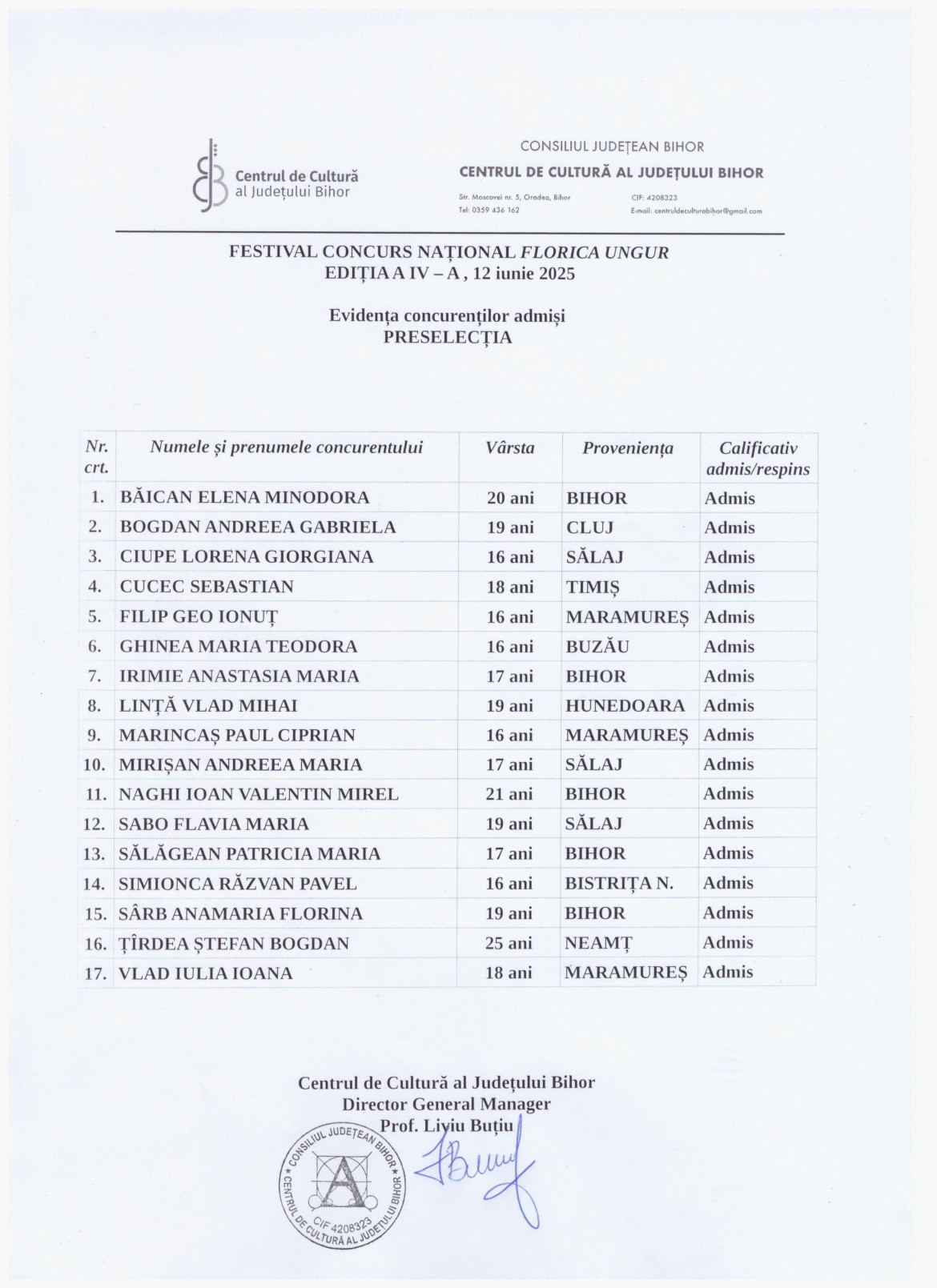 Lista concurenților admiși la Festivalul-Concurs Național “Florica Ungur” 2025!