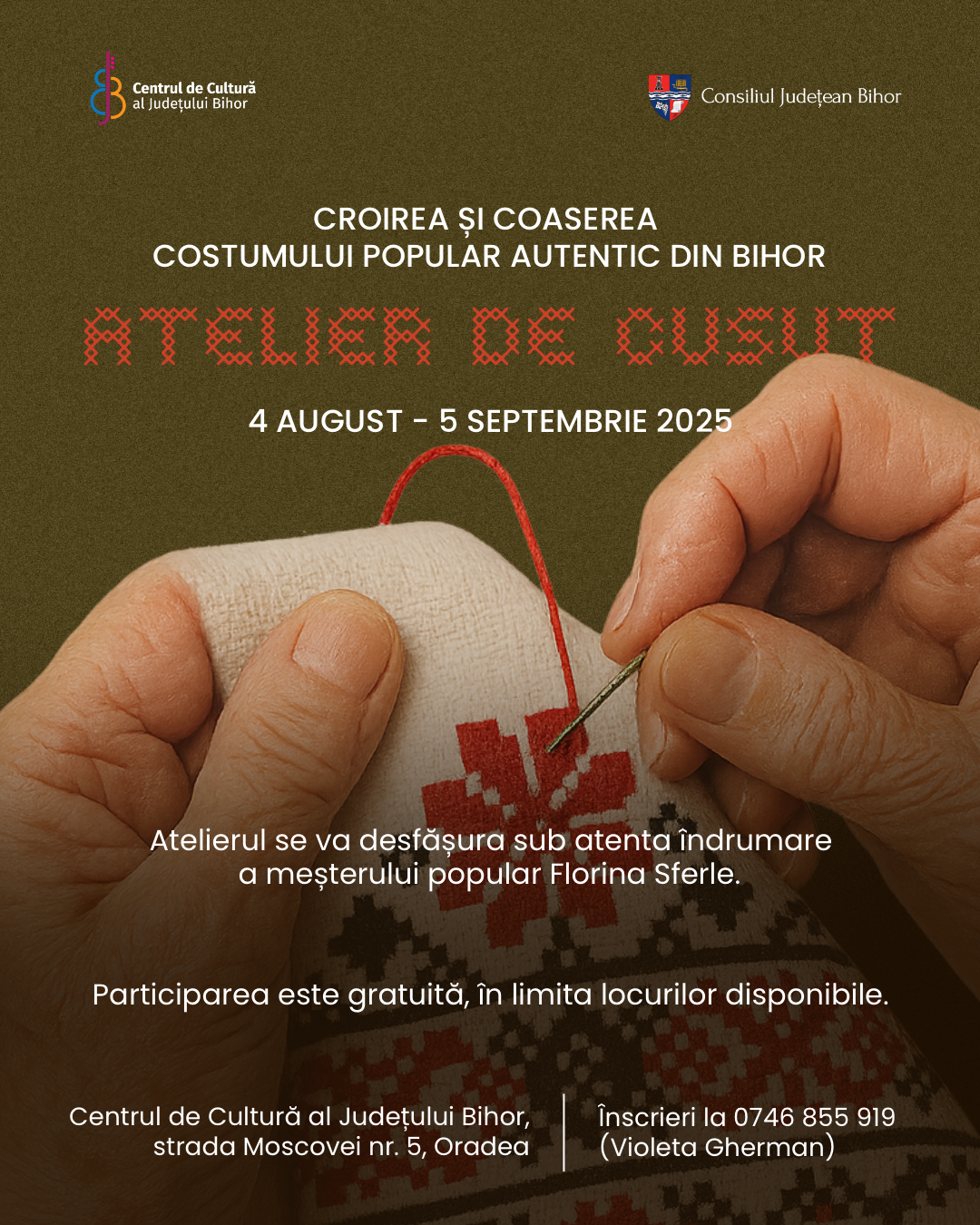 Centrul de Cultură al Județului Bihor invită publicul adult la un atelier autentic de cusut, desfășurat între 4 august și 5 septembrie 2025, de luni până vineri, între orele 11:00 și 13:00, la sediul instituției din str. Moscovei nr. 5, Oradea.