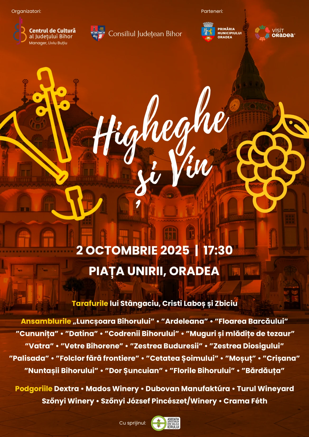 Joi, 2 octombrie 2025, ora 17:30, Piața Unirii din Oradea va găzdui un eveniment de mare amploare și importanță folclorica - „Higheghe și vin”, organizat de Centrul de Cultură al Județului Bihor și Consiliul Județean Bihor, în parteneriat cu Visit Oradea și Primăria Municipiului Oradea.