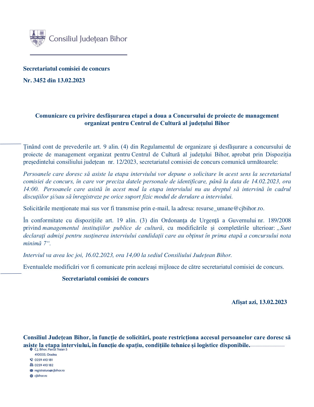 Comunicare cu privire desfășurarea etapei a doua a Concursului de proiecte de management organizat pentru Centrul de Cultură al judeţului Bihor