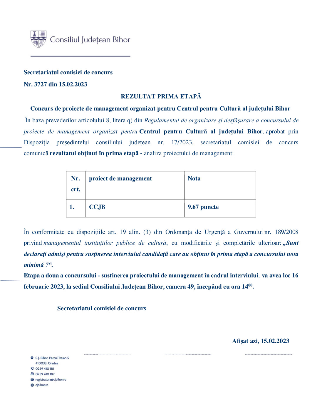 În baza prevederilor articolului 8, litera q) din Regulamentul de organizare şi desfăşurare a concursului de proiecte de management organizat pentru Centrul pentru Cultură al judeţului Bihor, aprobat prin Dispoziția președintelui consiliului județean nr. 17/2023, secretariatul comisiei de concurs comunică rezultatul obținut în prima etapă - analiza proiectului de management: