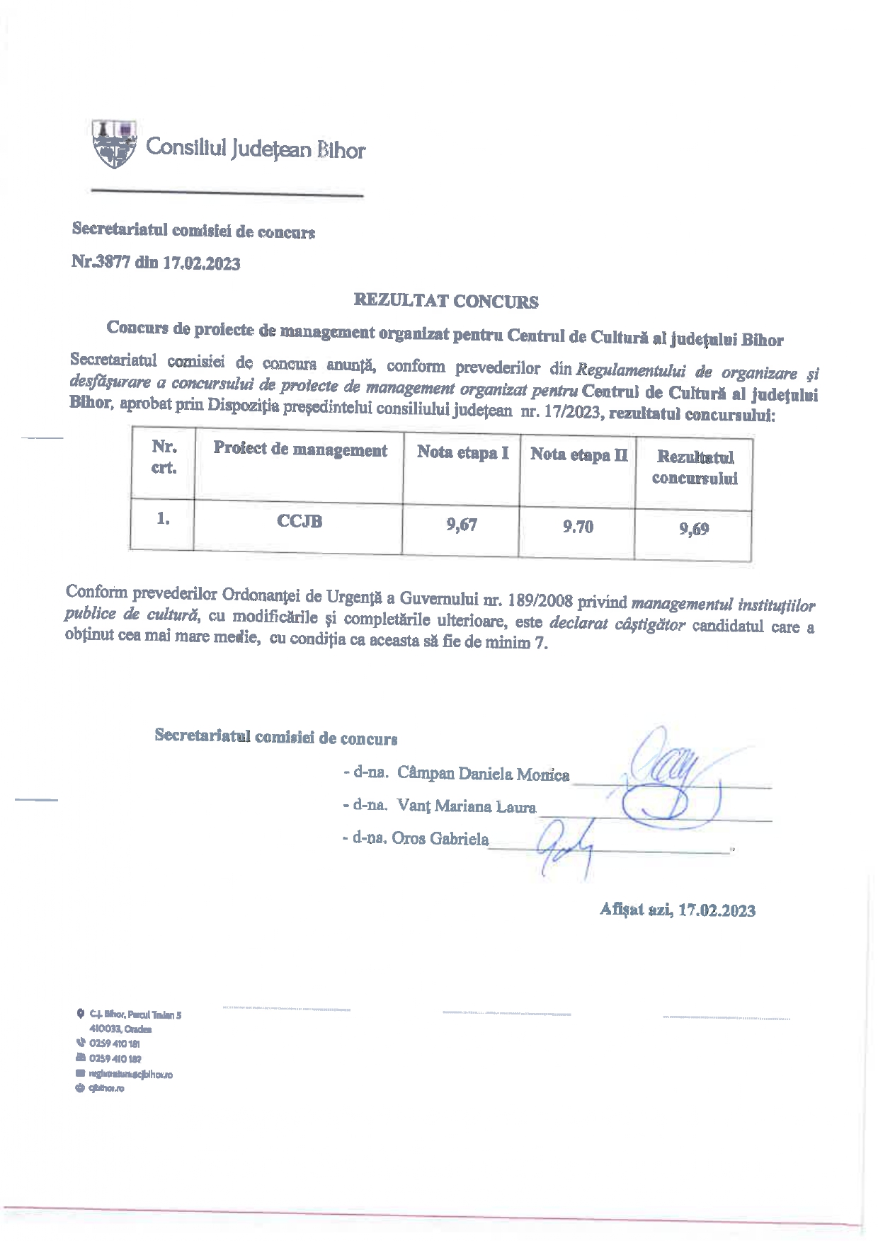 Secretariatul comisiei de concurs anunță, conform prevederilor din Regulamentul de organizare și desfășurare a concursului de proiecte de management organizat pentru Centrul de Cultură al Județului Bihor, aprobat prin Dispoziția președintelui consiliului județean nr. 17 / 2023, rezultatul concursului.