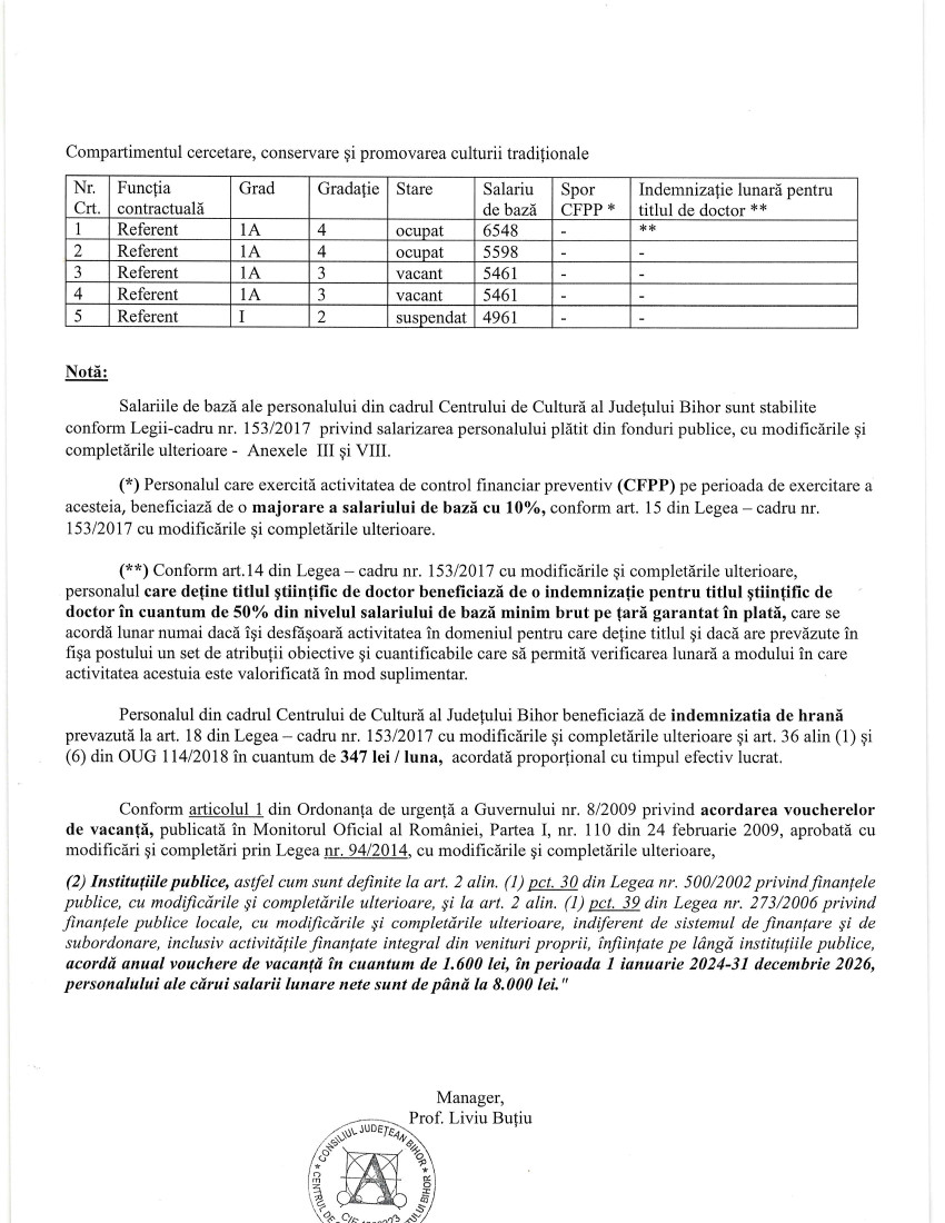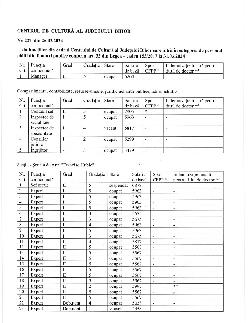 Lista funcțiilor din cadrul Centrului de Cultură al Județului Bihor care intră în categoria de personal plătit din fonduri publice conform art. 33 din Legea – cadru 153/2017