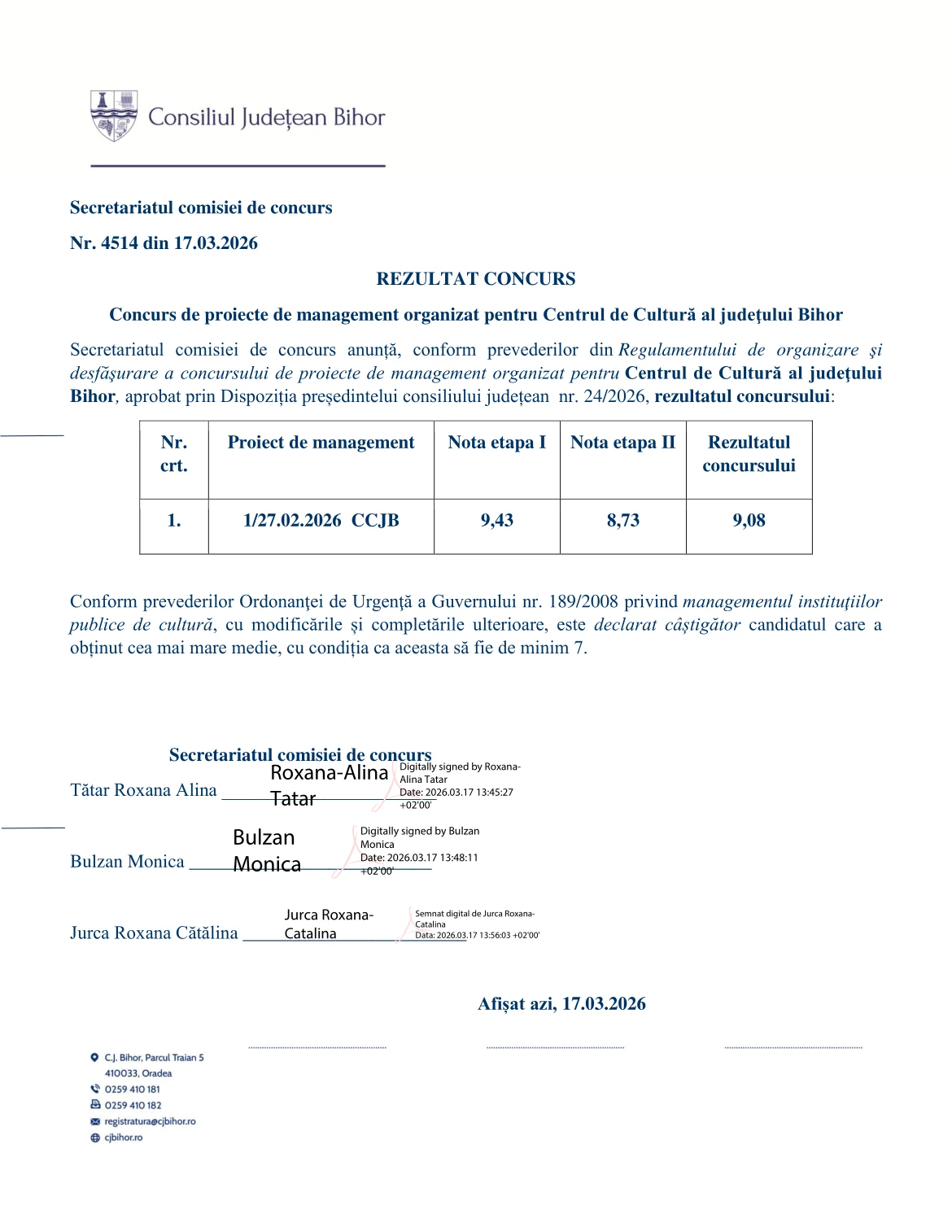 Rezultatul concursului de proiecte de management organizat pentru Centrul de Cultură al Județului Bihor.