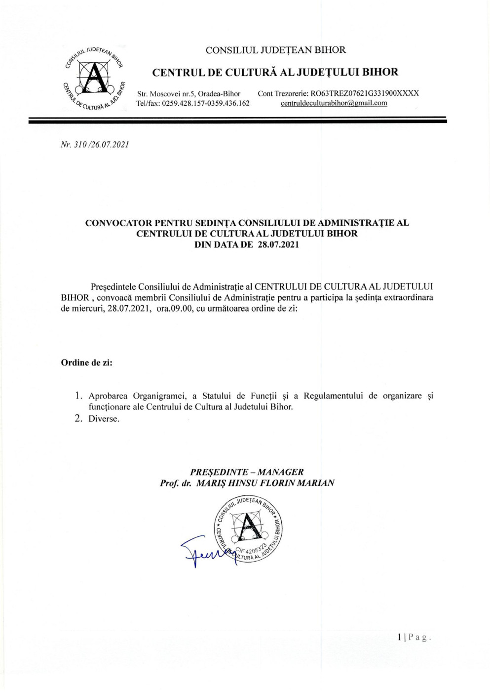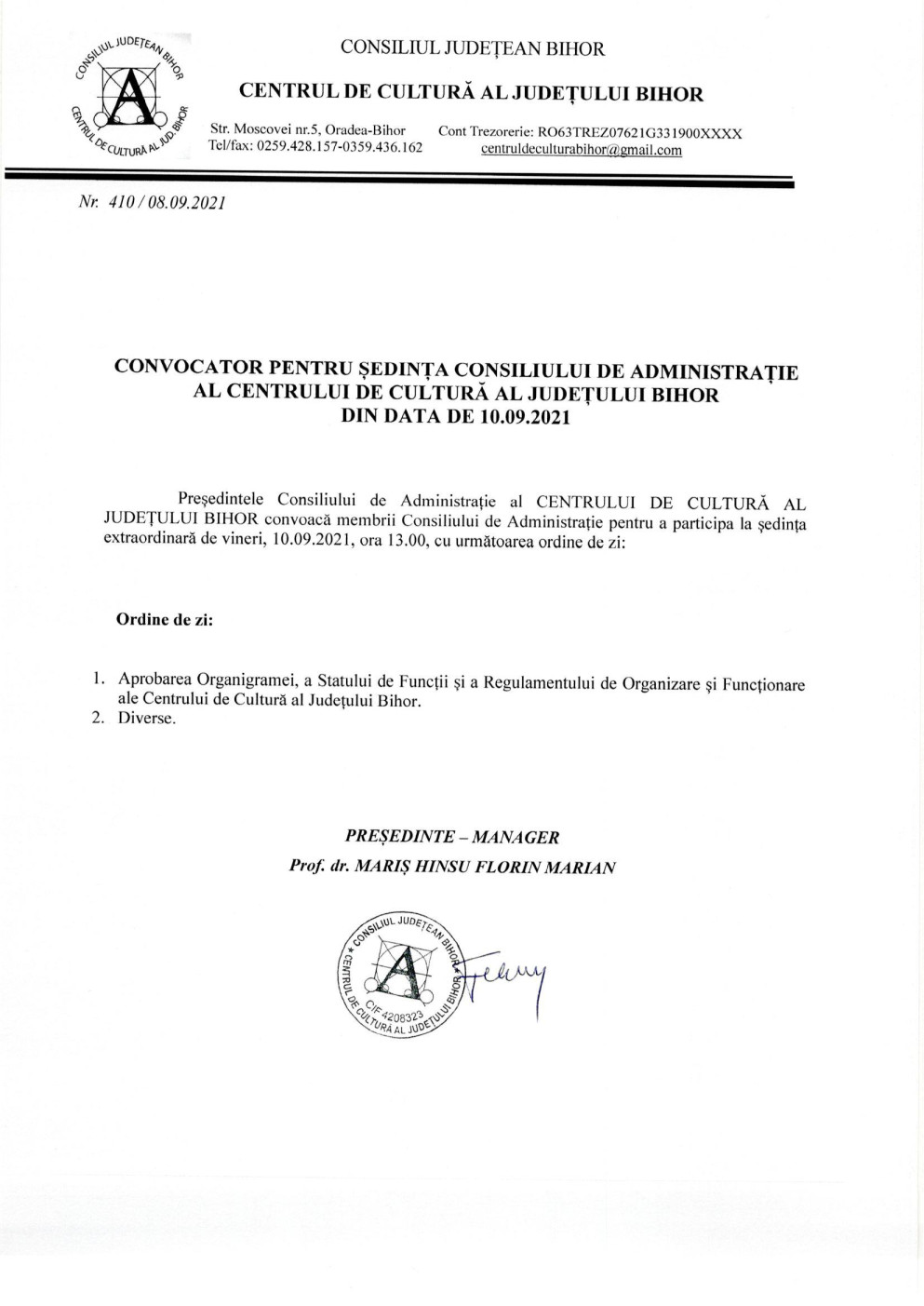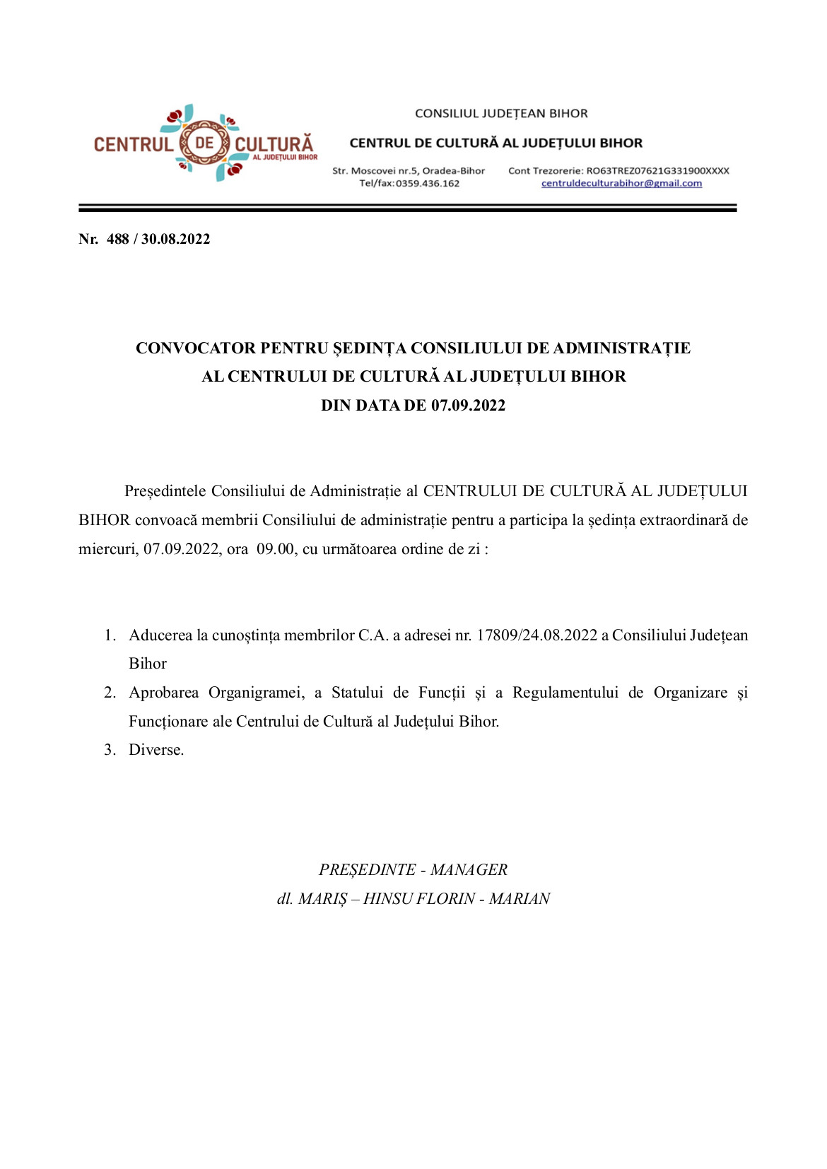 Consiliul Județean Bihor organizează, la sediul său din Mun. Oradea, P-cul Traian, nr. 5, Jud. Bihor, în conformitate cu prevederile Ordonanţei de urgenţă a Guvernului nr. 189/2008 privind managementul instituţiilor publice de cultură, aprobată prin Legea nr. 269/2009, cu modificările şi completările ulterioare şi ale Ordinului ministrului culturii nr. 2799/2015 pentru aprobarea Regulamentului-cadru de organizare şi desfăşurare a concursului de proiecte de management, a Regulamentului-cadru de organizare şi desfăşurare a evaluării managementului, a modelului-cadru al caietului de obiective, a modelului-cadru al raportului de activitate, precum şi a modelului-cadru al contractului de management, concursul de proiecte de management pentru Centrul de Cultură al județului Bihor.