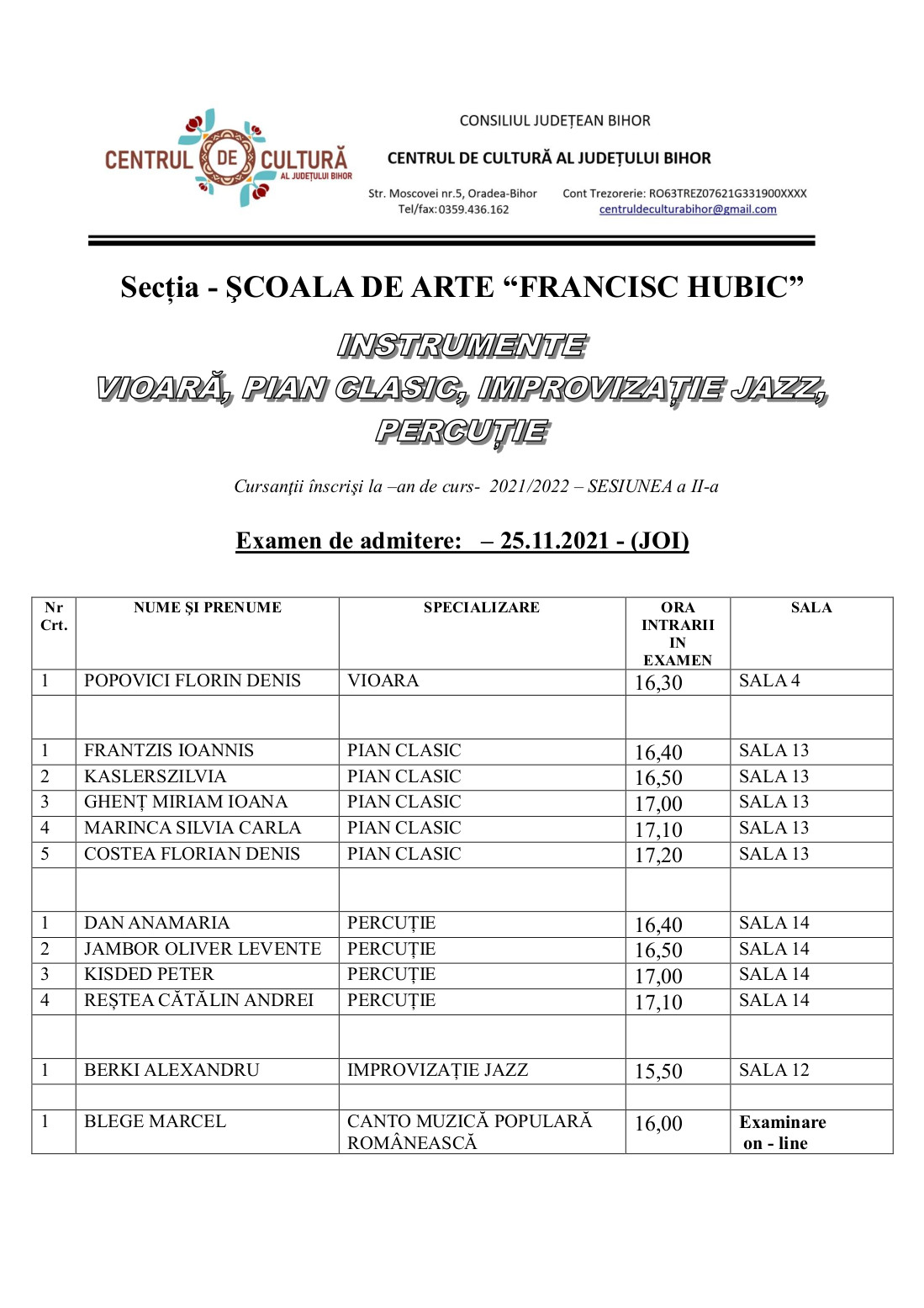 În atașament regăsiți programul de desfășurare al examenelor de aptitudini pentru admiterea în anul de curs 2021/2022. Programul poate suferi modificări în funcție de evoluția pandemiei de Covid- 19 și a hotărârilor autorităților publice.